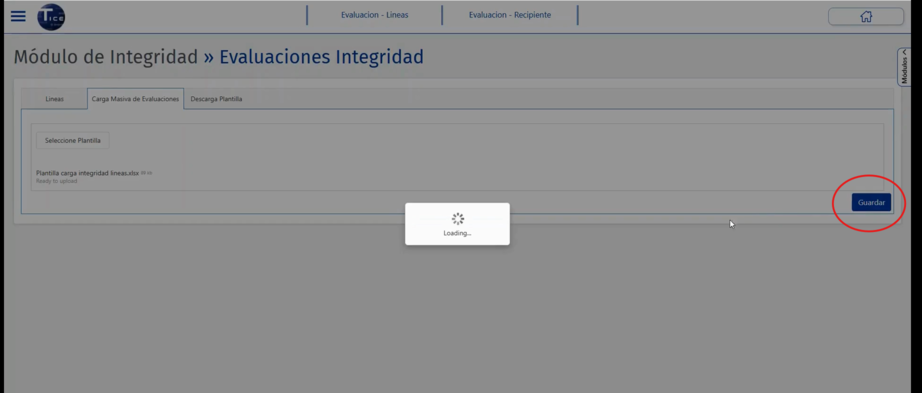 3.5. Ejecución de Carga: Una vez seleccionada la plantilla, haga clic en el botón “Guardar” para iniciar el proceso de carga de datos. El sistema mostrará un indicador de progreso (“Loading…”) mientras procesa la información.