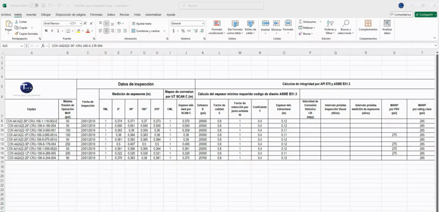 Para Tuberías: Podrá visualizar mediciones de espesores, mapeo de corrosión (UT SCAN C), factor de reducción por junta soldada, espesor mínimo requerido de código de diseño (ASME B31.3), entre otros.