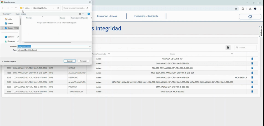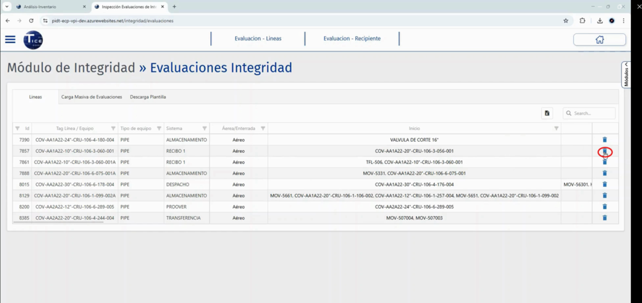 4.1. Acceso a Evaluaciones: Las evaluaciones de integridad para los activos cargados serán visibles automáticamente en la tabla de la pestaña correspondiente (“Evaluación – Líneas” para tuberías o “Evaluación – Recipiente” para recipientes).