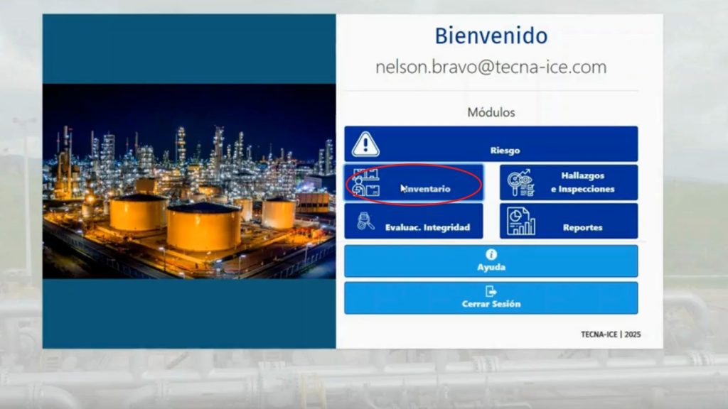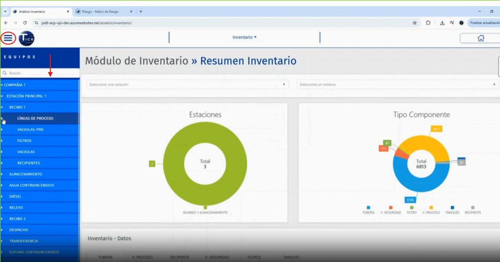 Para visualizar la ficha técnica de cualquiera de los activos incluidos en el inventario, ya sea tuberías, tanques, recipientes filtros etc., se debe acceder al árbol de equipos a través del ícono: “tres barras paralelas horizontales” en la parte superior izquierda de la visual de PIDT en el módulo inventario. Así se despliega el árbol de equipos.