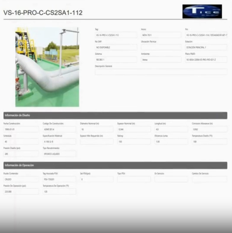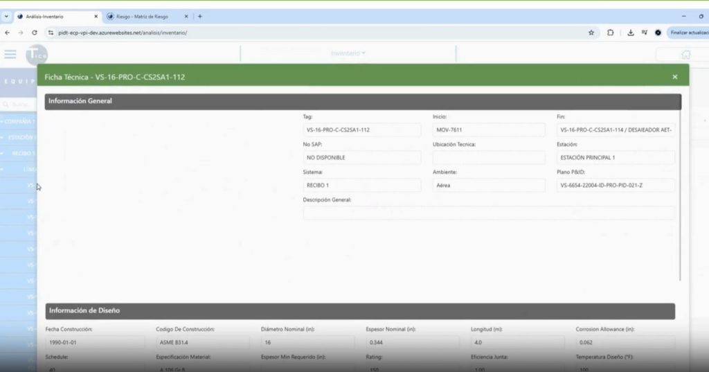 Diligenciamiento de plantillas de inventario de activos estáticos: tuberías, recipientes, filtros, tanques, válvulas de proceso y válvulas de seguridad, las cuales están diseñadas en hojas de Excel.