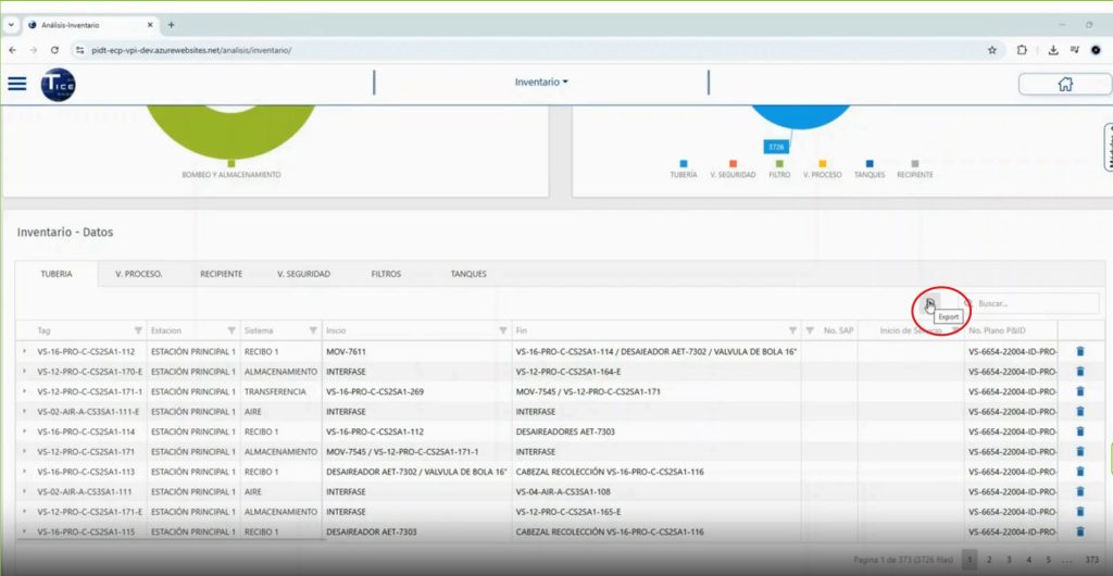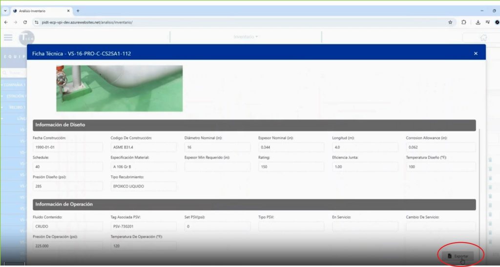 En la caja de búsqueda o accediendo directamente, al árbol de equipos se puede seleccionar el tag del activo de interés, y sobre el tag se puede acceder a la ficha técnica, la cual se desplegará para visualizarse y de igual manera así puede descargar con el botón “Exportar”, generando un archivo PDF.