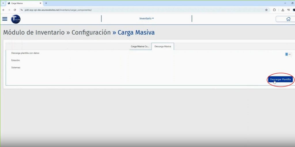 Se ingresa al Módulo de inventario y ficha técnica, se despliega el menú “Inventario”, se selecciona la funcionalidad “Carga Masiva de Inventario” y se selecciona la pestaña “Descarga Masiva”, en el botón “Descargar Plantilla” se obtiene la plantilla en blanco.