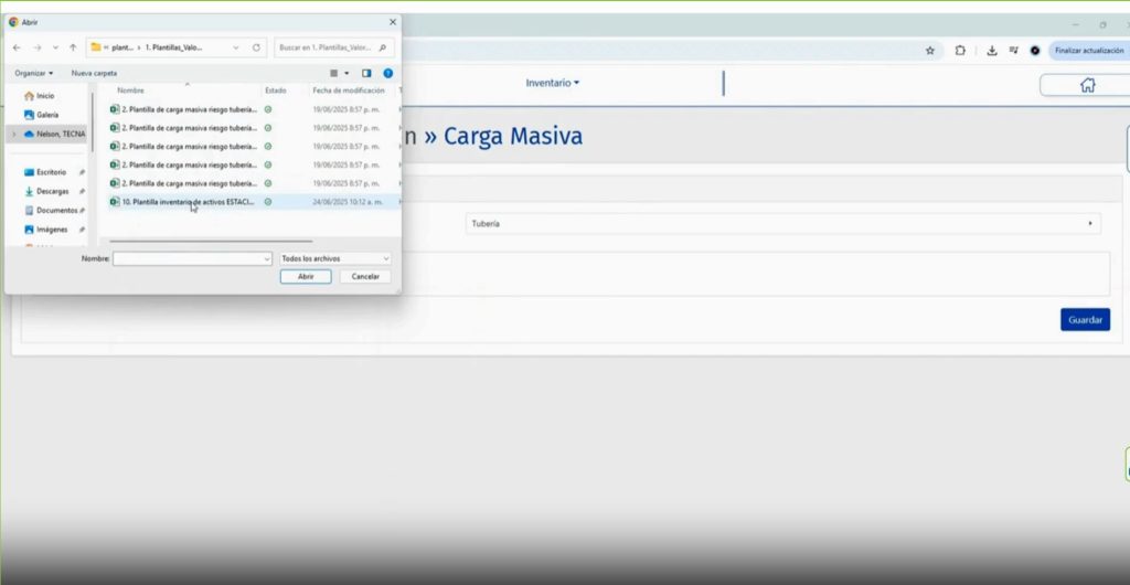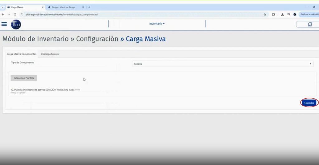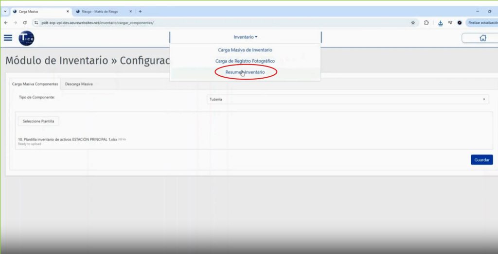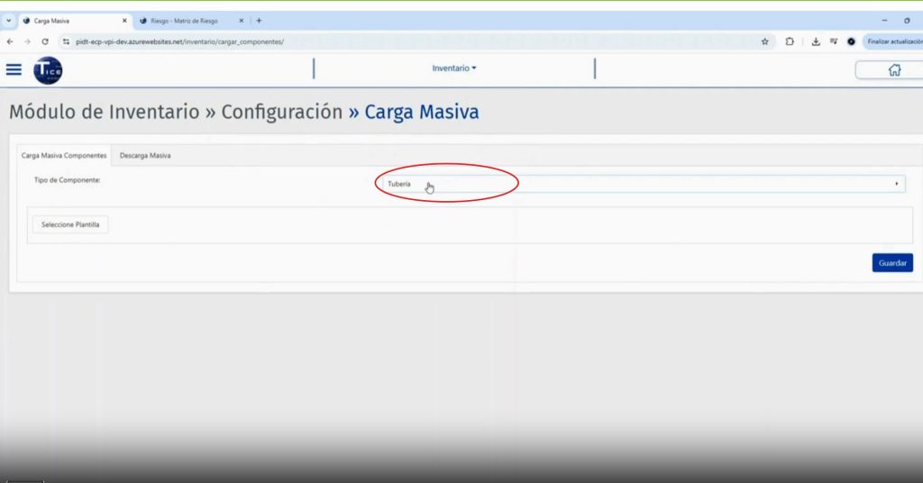 En la pestaña “Carga Masiva Componentes”, en la caja “Tipo de Componente”, se selecciona el tipo de activo a cargar en el inventario: Tuberia, Válvula, Válvula PRD, Filtro, Recipiente o Tanque.