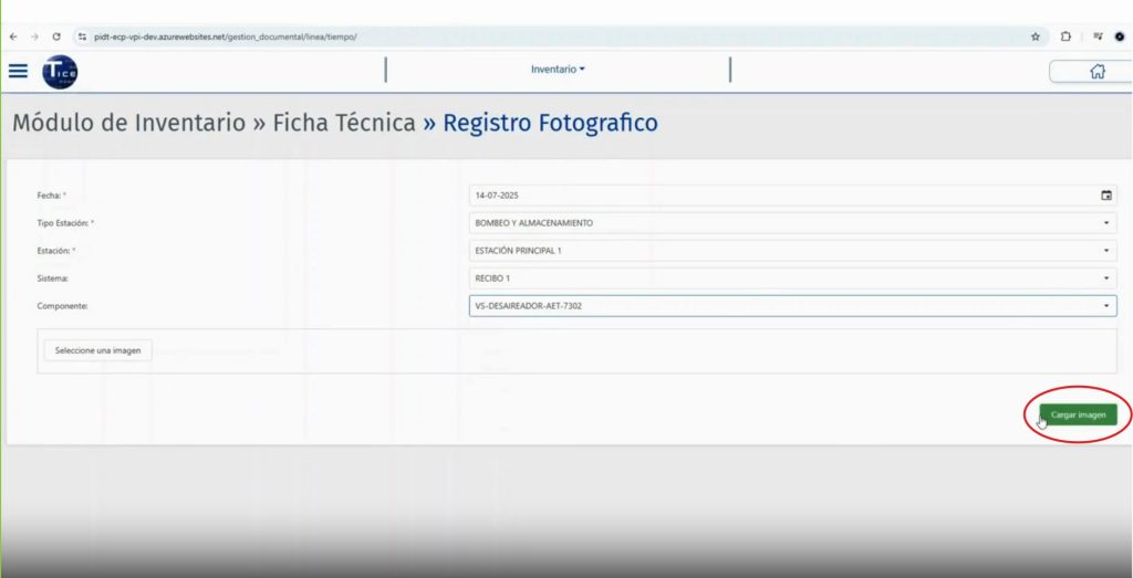 Se despliega una tabla la cual se debe diligenciar con la información requerida y con el botón “Seleccione una imagen” se selecciona el registro a cargar y se oprime el botón “Cargar imagen”, así PIDT procederá al cargue del archivo seleccionado. Los registros fotográficos cargados se asocian a los activos seleccionados y estos se visualizarán en la ficha técnica.
