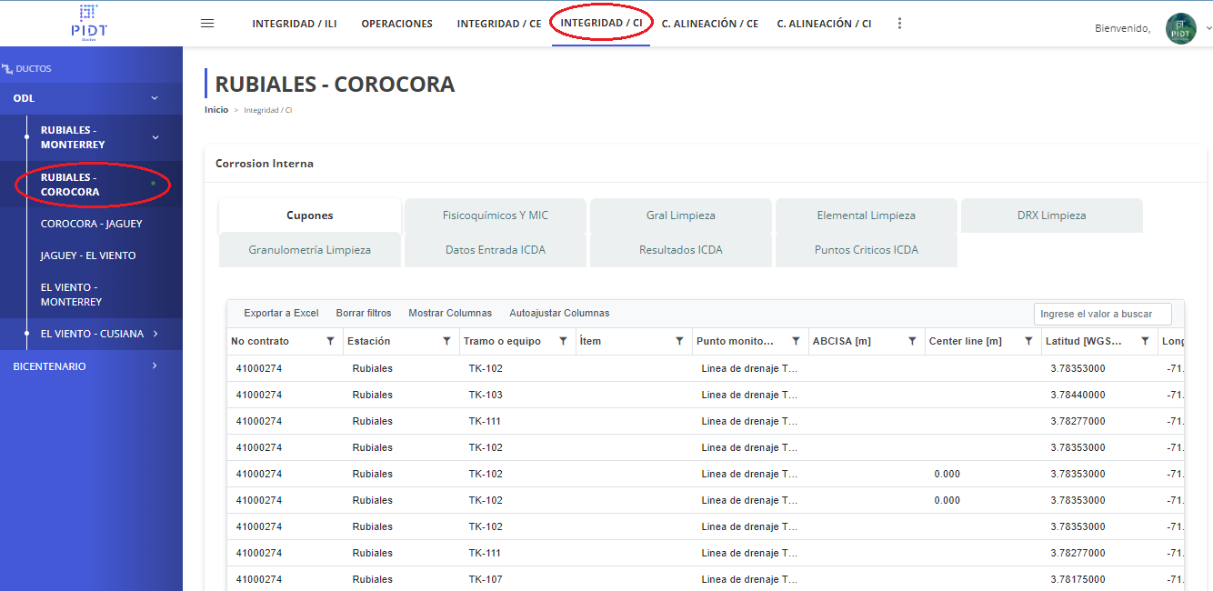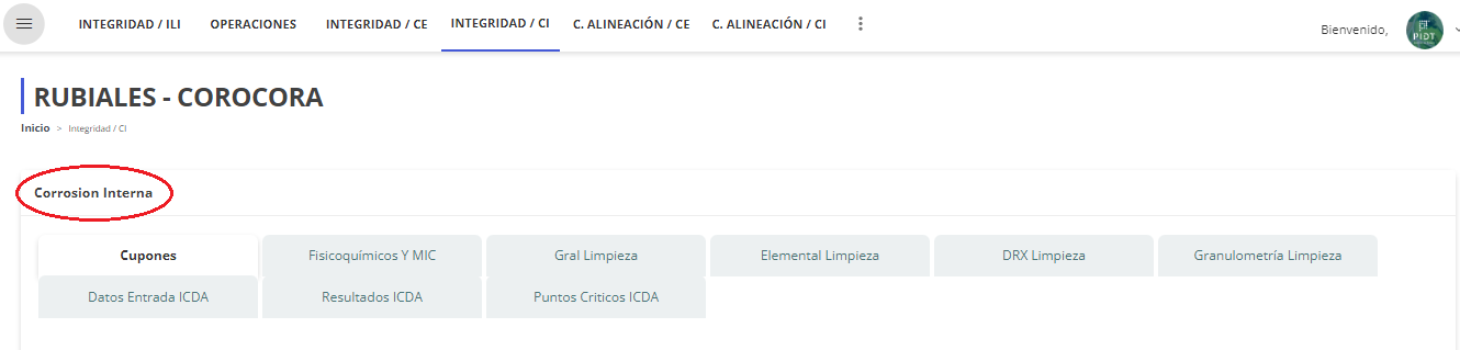 En este módulo encontrará la gestión realizada y la trazabilidad para la amenaza de Corrosión Interna. En la parte izquierda encontrará el árbol de equipos bajo la estructura jerárquica de la compañía, donde seleccionará el hallazgo que sea de su interés.