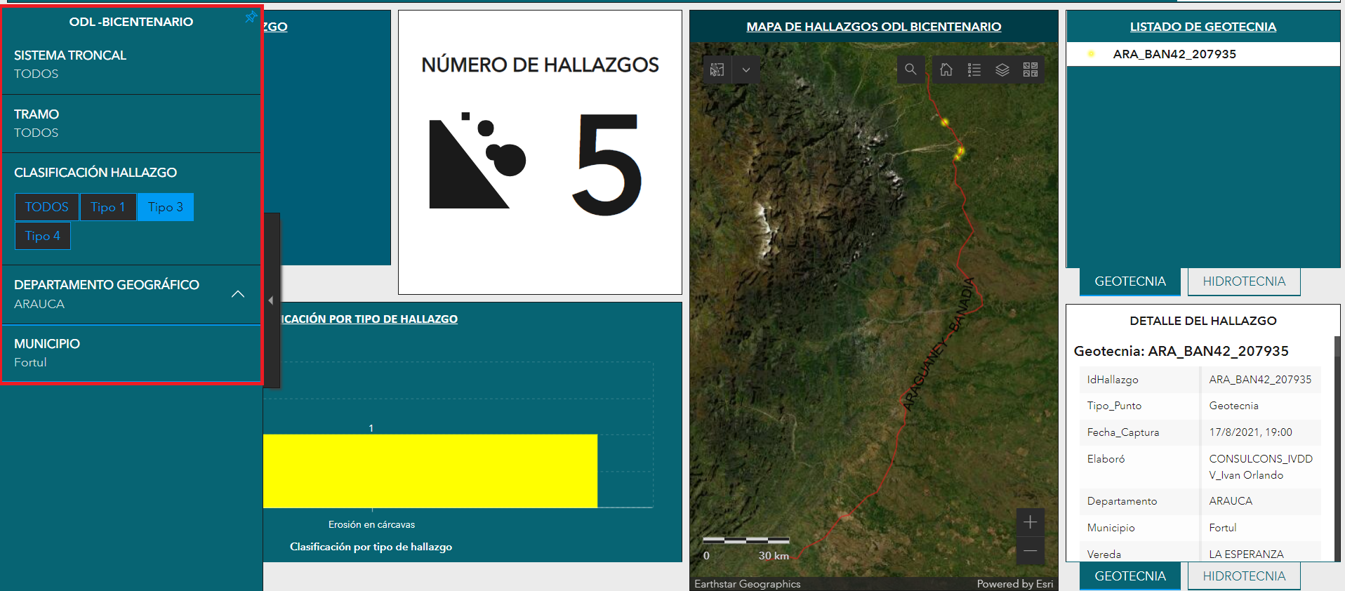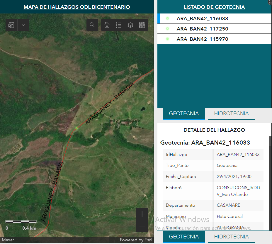 Al ingresar en el Listado de Geotecnia, Al seleccionar un dato encontrara en el lugar que se encuentra ubicado Junto al detalle que contiene el hallazgo.