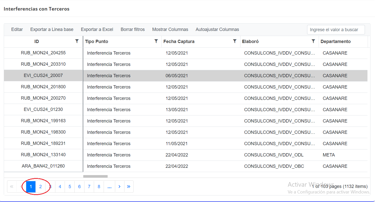 En este módulo encontrará la gestión realizada y la trazabilidad para la amenaza de Interferencias con Terceros. al ingresar encontrara una tabla con los datos que contiene el modulo actualmente.