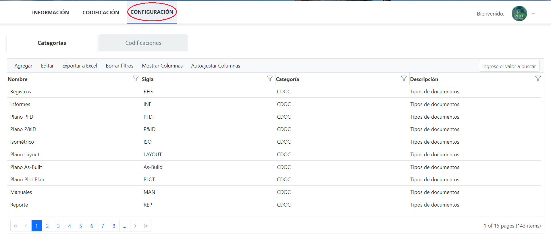 Al darle click en el botón Configuración encontrará dos filtros, Categoría y Codificación en el cual al seleccionar uno de los dos encontrara una tabla con los datos que están registrados actualmente, en el cual tendra la funcion de editar los datos o agregar una nueva columna.