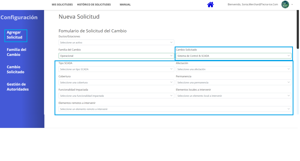 - Al seleccionar en el campo “Cambio Solicitado” la opción de “Sistema de control & SCADA” se desplegarán los siguientes campos: