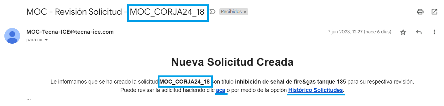 Cada registro de “Nueva Solicitud” queda identificada con un ID, el cuál se genera de forma automática iniciando con las siglas de Manejo del cambio (MOC) seguido de la ubicación del cambio correspondiente a las siglas del activo seleccionado y un número como consecutivo del cambio solicitado desde 1 hasta n. (MOC-UBI-001).