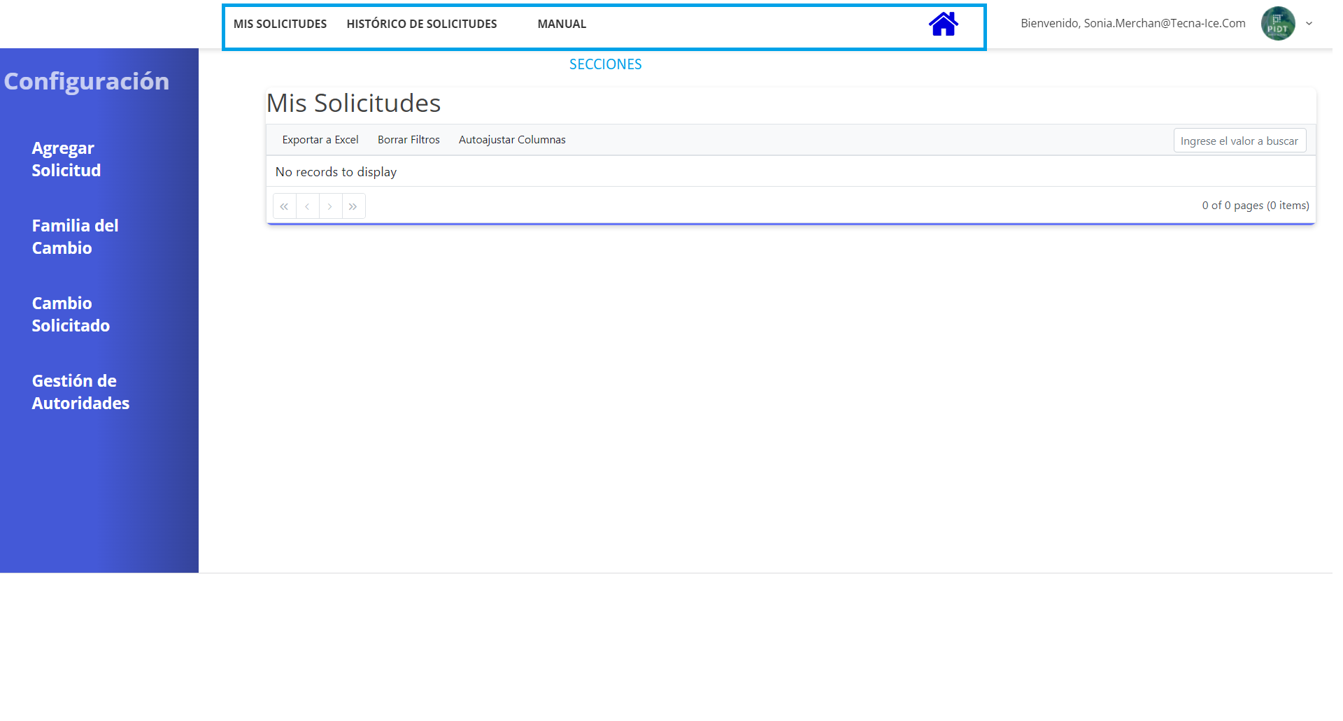 En la parte superior del módulo, encontrarás las secciones correspondientes al resumen de “Mis Solicitudes” y el “Histórico de Solicitudes” generadas por todos los usuarios del módulo. También encontrarás la sección de “Manual” y el enlace al “Inicio”, representado con un icono en forma de casa.