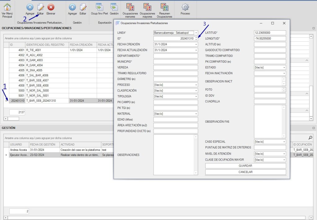 Editar Esta opción nos permite editar una ocupación Para editar una ocupación es mediante el menú superior descrito en la sección: Formulario principal Para editar una ocupación es necesario:Seleccionar la ocupación en la tablaProceder a hacer clic en el botón editarPosteriormente carga el formulario para la edición con los datos cargados Validaciones del botón Guardar Valida que los campos obligatorios (marcados con el carácter *) sean diligenciadosValida que la “Fecha Creación” y “Fecha Actualización” no sea superior a la fecha del sistemaValida que el numero de ID no se haya registrado con anterioridadSi el estado es “Inactivo”, valida que la fecha sea obligatoria y menor que la fecha del sistemaValida que la Longitud y Latitud estén dentro del espectro colombiano