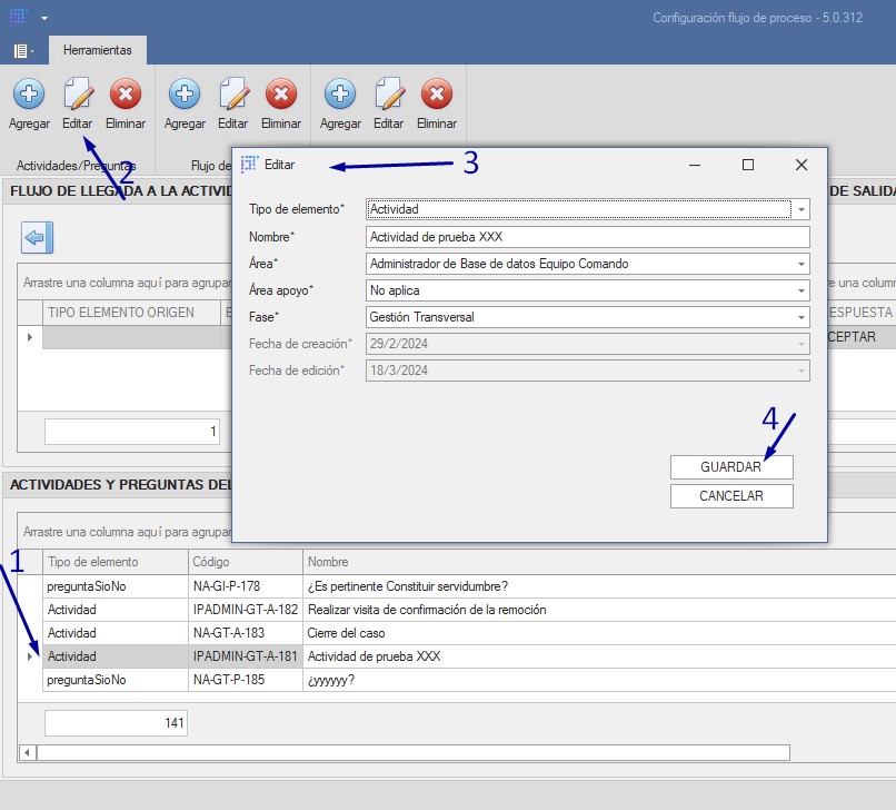 Editar Esta opción nos permite editar una actividad o pregunta Para editar una actividad o pregunta es mediante el menú superior descrito en la sección: Formulario de proceso Para editar una ocupación es necesario: Seleccionar la actividad o pregunta en la tablaProceder a hacer clic en el botón editarPosteriormente carga el formulario para la edición con los datos cargados Validaciones del botón Guardar Valida que los campos obligatorios (marcados con el carácter *) sean diligenciados