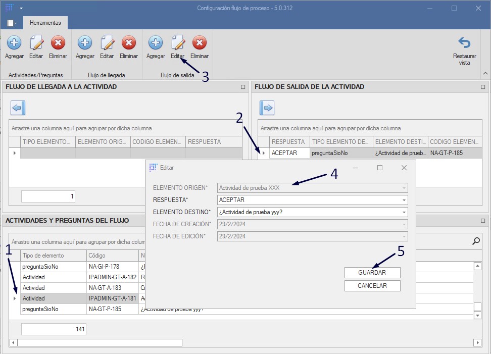 Editar Esta opción nos permite editar un flujo de salida de una actividad o pregunta Para editar un flujo de salida de una actividad o pregunta es mediante el menú superior descrito en la sección: Formulario de proceso Para editar un flujo de salida de una actividad o pegunta es necesario: Seleccionar la actividad o pregunta en la tablaSeleccionar el flujo de salidaProceder a hacer clic en el botón editarSeleccionar o modificar cada uno de los campos necesariosElemento de origen: Elemento de solo lectura, es la actividad o pregunta seleccionada en el paso 1Respuesta: Para una actividad la respuesta es ACEPTAR, para una pregunta la respuesta son SI y NO. Esta respuesta es del elemento de origen.Elemento de destino: Puede seleccionar una actividad o una pregunta de destino